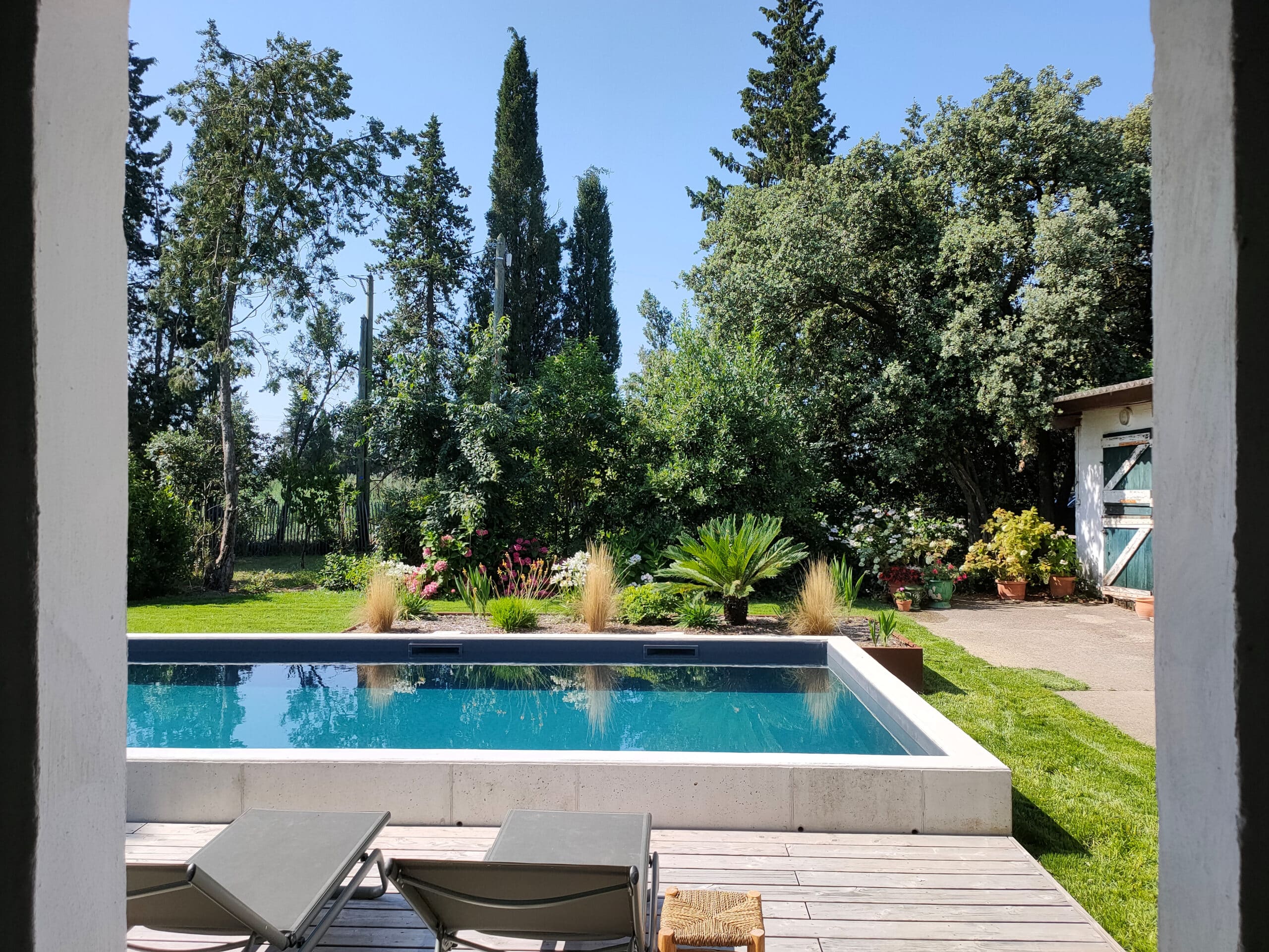 Le revêtement intérieur du bassin de coloris gris anthracite a été pensé pour limiter l’impact visuel de celui-ci. Le rendu en eau, d’un bleu-vert profond, a aussi été inspiré du milieu naturel environnant, comme le Gardon.