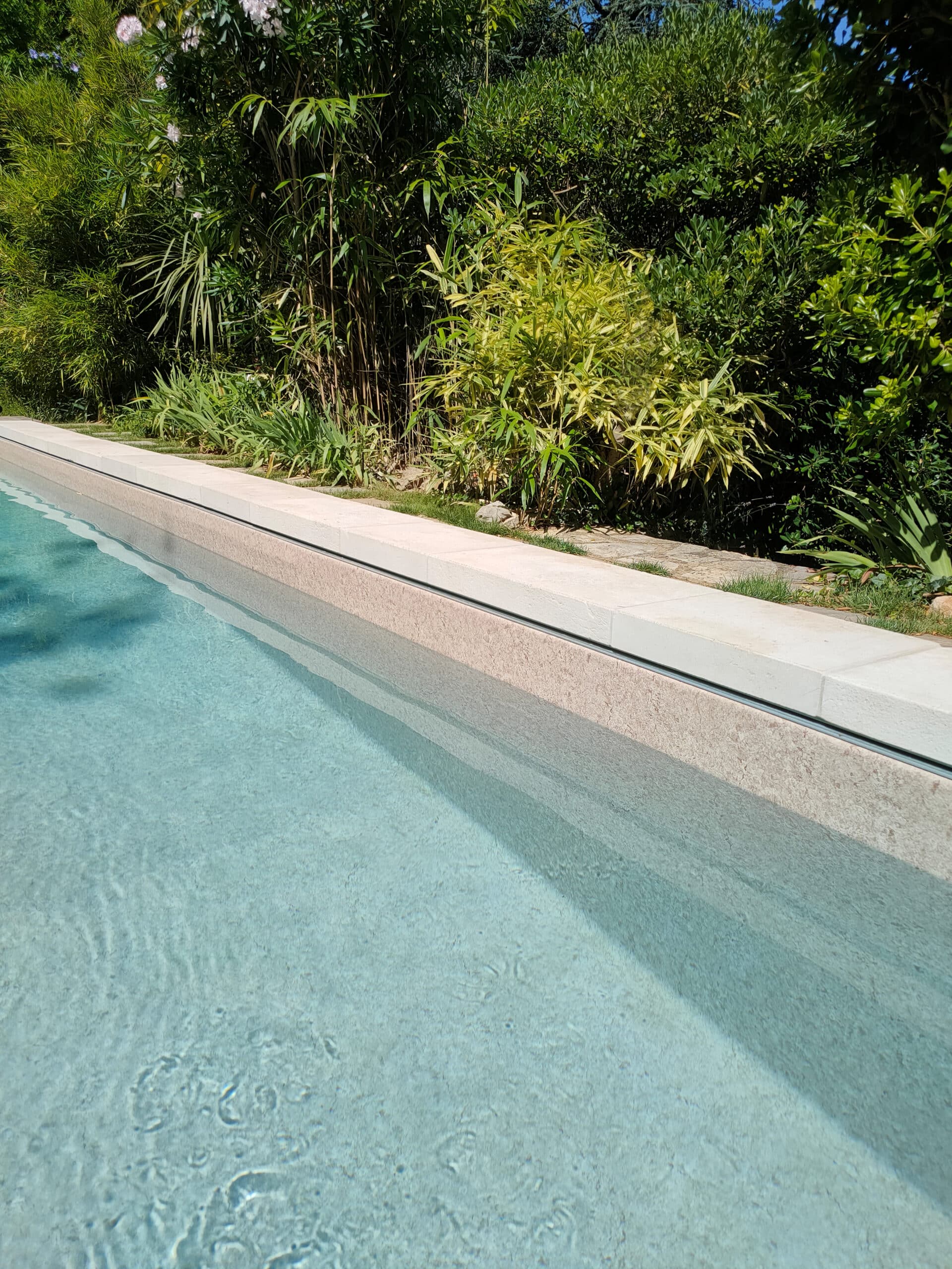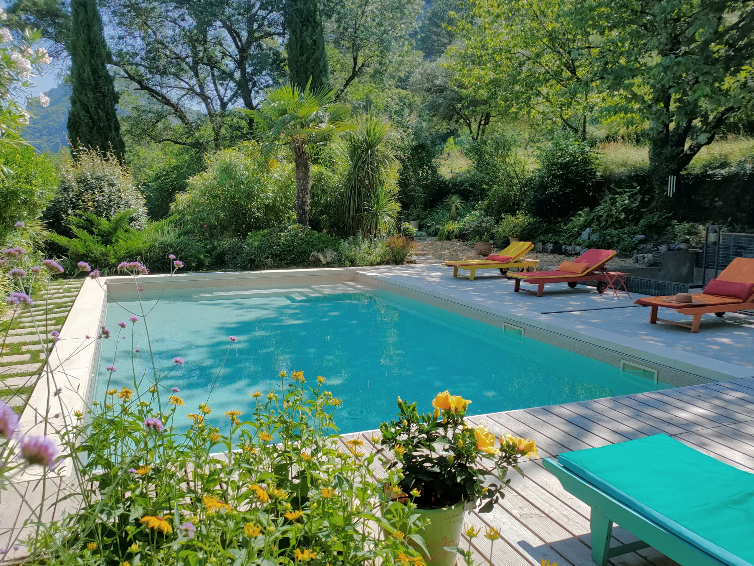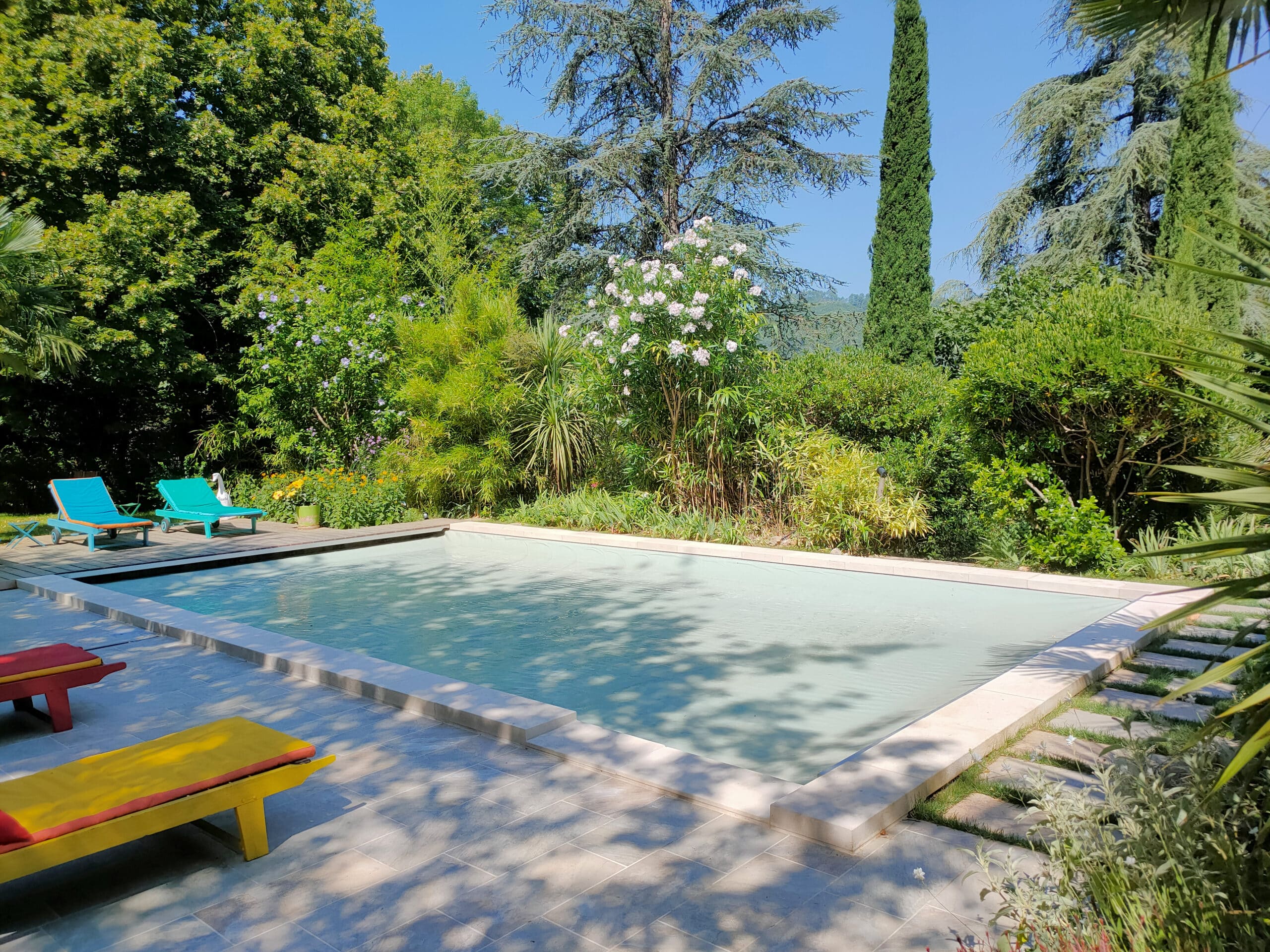 Des couleurs flamboyantes… Une végétation luxuriante… Un soleil de plomb… Cette piscine est une invitation au voyage. Et pourtant, nous sommes dans le Gard! Un bassin aux belles dimensions dans lequel nager et jouer, un revêtement d’étanchéité effet 3D grains de sable pour une eau tropicale, une grande banquette immergée pour profiter des beaux jours. Sécurité du bassin grâce à la couverture automatique, toile coloris vert amande.